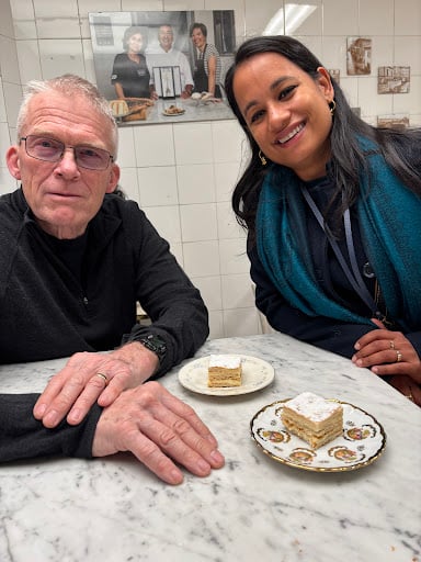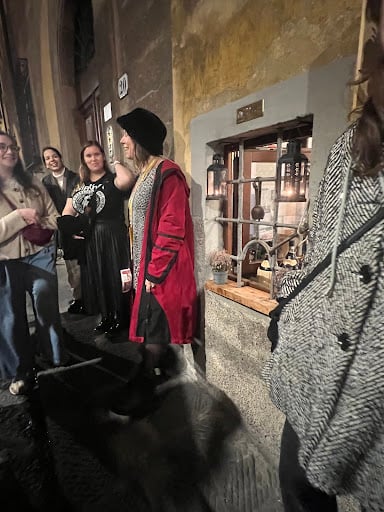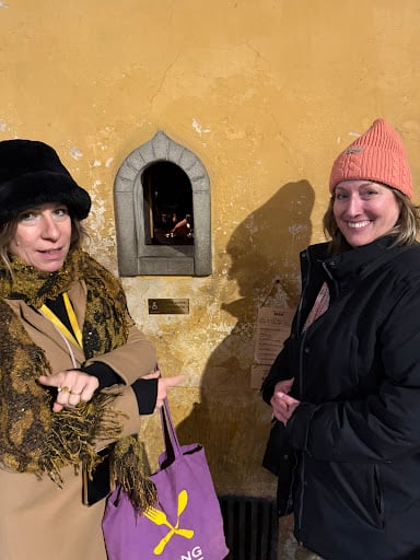 Your guide will be waiting for you and wearing our purple Eating Europe bag at the fountain.